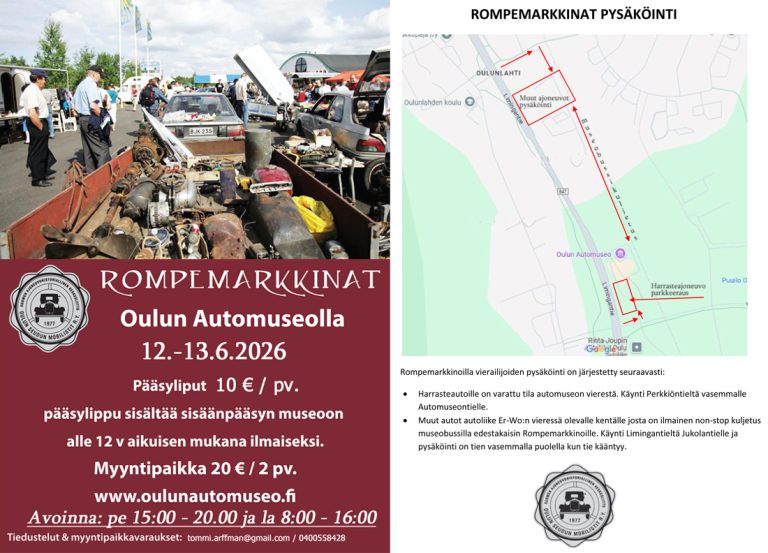 HUOM! Pysäköinti järjestelyt: Harrasteautoille on varattu P-Paikka automuseon ja ST-1 kylmäaseman välistä. Kaikki muut ajoneuvot toivomme pysäköitävän Jukolantien varressa olevalle tyhjälle tontille autoliike Er-Wo:n vieressä. P-paikalta on ilmainen non-stop museobussikuljetus Rompemarkkinoilla.