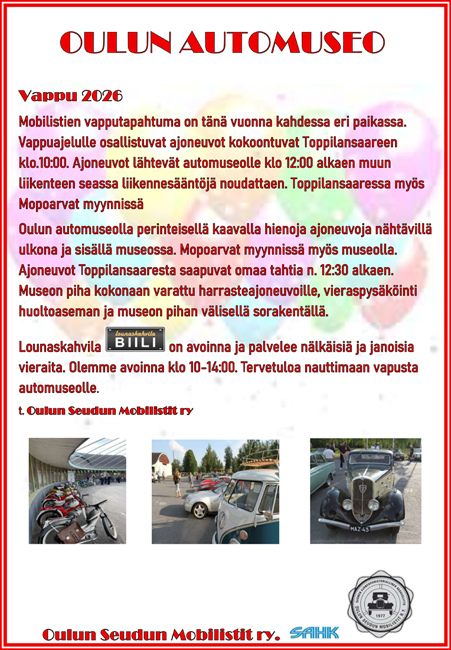 Vappuna Oulun automuseolla tapahtuu. Vappuajelun päätepiste on Oulun automuseo jonne autojen odotetaan saapuvan klo 12.30 alkaen. Lounaskahvila Biili on avoinna klo 10.00 - 14.00. Tarjolla vappulounas, ulkona makkaranmyynti ja muutakin hyvää. Mopoarvat ovat myynnissä museolla ja poikkeuksellisesti museoon on lipunmyynti sekä käynti ison päätyoven kautta. Iloista mieltä, hyvää säätä ja hauskoja juttuja tarjolla. Kannattaa tulla isolla joukolla ja jos sinulla on harrasteajoneuvo, niin vappuna sillä kannattaa suunnta Oulun automuseolle.